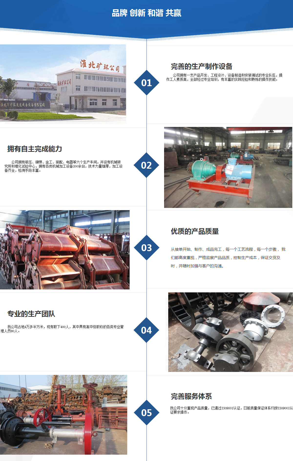 淮北市礦環洗選成套設備有限公司(原淮北礦山機器廠)是經改制重組后的新型股份制企業,公司座落在皖北經濟中心——淮北市,東鄰京滬線,北靠隴海線,距徐州民航機場僅50公里,交通、通訊十分便利。我公司占地4萬多半方米,現有職下400人,其中具有高中級職稱的各類專業管理人員80人。 公司擁有一支產品開發、工程沒汁、設備制造和安裝調試的專業隊伍,操作工人素質高,全部經過專業培訓,有豐富的實踐經驗和熟練的操作技能。公司擁有鍛壓、鉚焊、金工、裝配、電器等六個生產車間,并設有機械研究所和理化試驗中心,擁有各類機械加工設備200余臺,技術力量雄厚,加工設備齊全,檢測手段豐富。建廠三十多年來,為煤炭、冶金、電力、市政、輕工、化工、建材等行業提供了大量的通用設備和專用設備,深受用戶好評,系皖北地區的機械加工中心。我公司十分重視產品質量,已通過ISO900l認證,日前質量保證體系均按ISO900l認證要求操作。